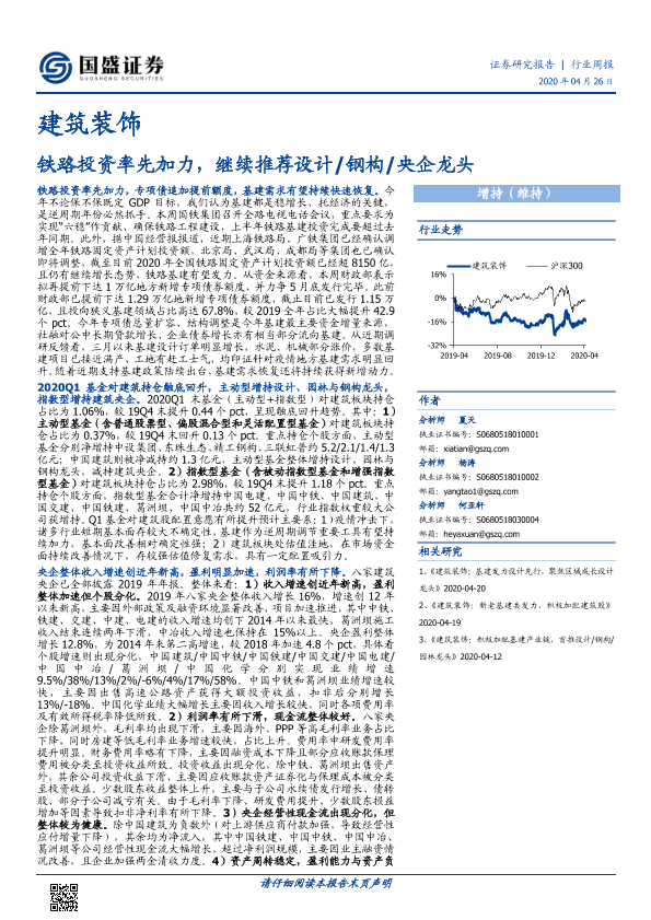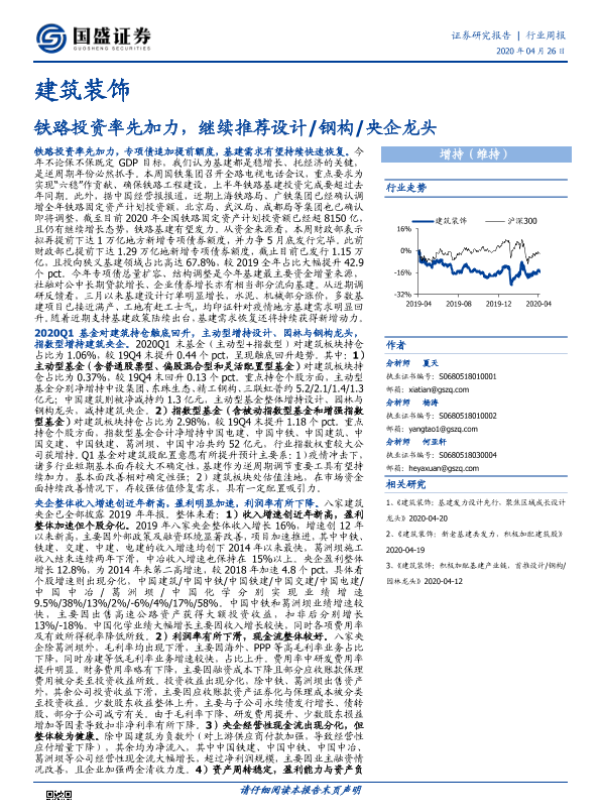 【国盛证券】【20200426】建筑装饰行业周报:铁路投资率先加力,继续推荐设计 钢构 央企龙头-20页