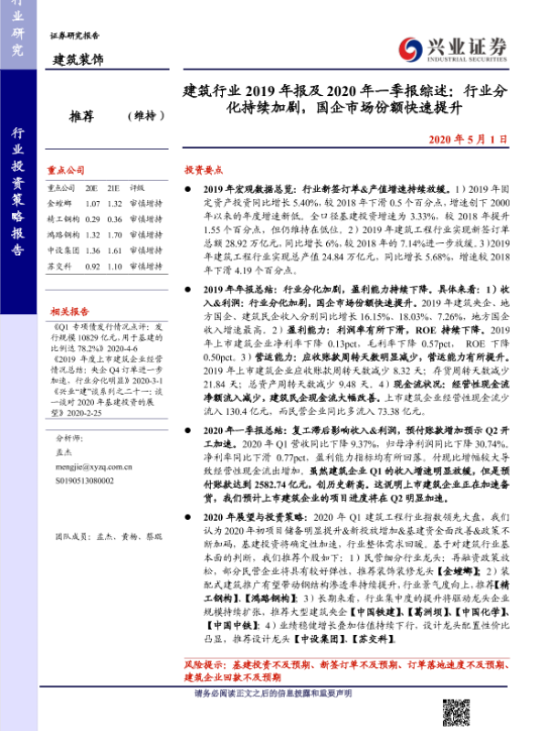 【兴业证券】【20200501】建筑行业2019年报及2020年一季报综述:行业分化持续加剧,国企市场份额快速提升-34页