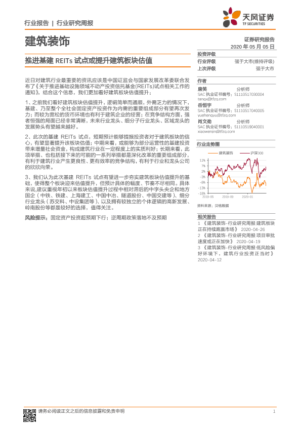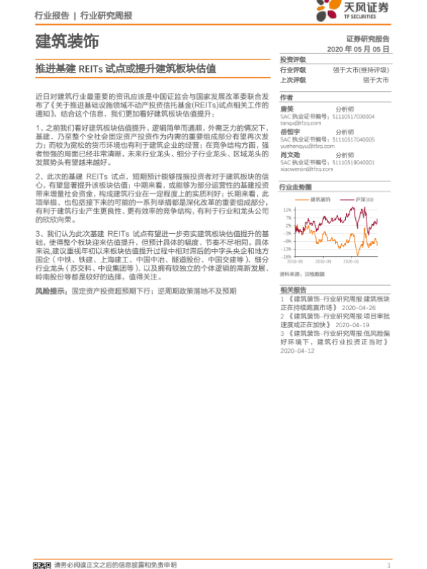 【天风证券】【20200505】建筑装饰行业研究周报:推进基建REITs试点或提升建筑板块估值-2页