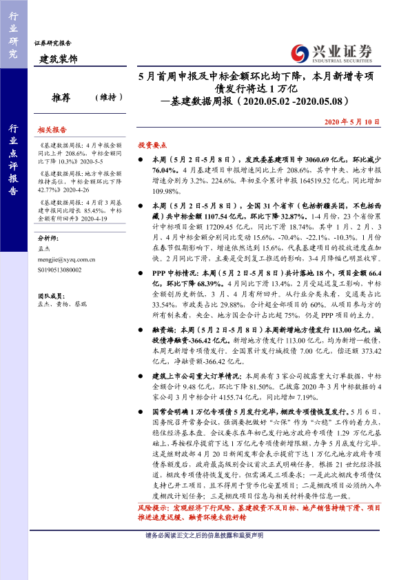 【兴业证券】【20200510】5月首周申报及中标金额环比均下降,本月新增专项债发行将达1万亿-24页