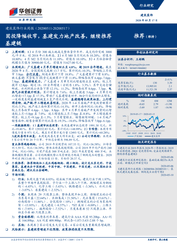 【华创证券】【20200517】建筑装饰行业周报:固投降幅收窄,基建发力地产改善,继续推荐基建链-18页