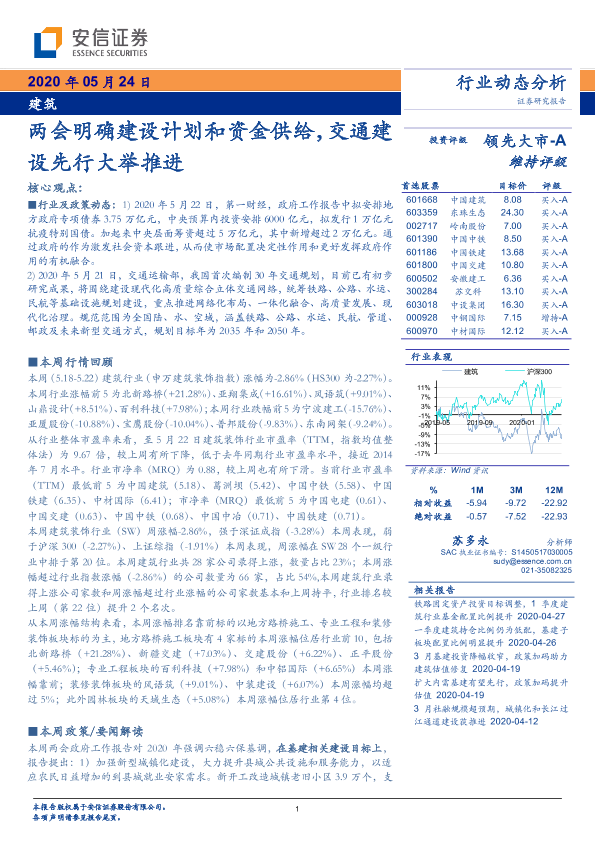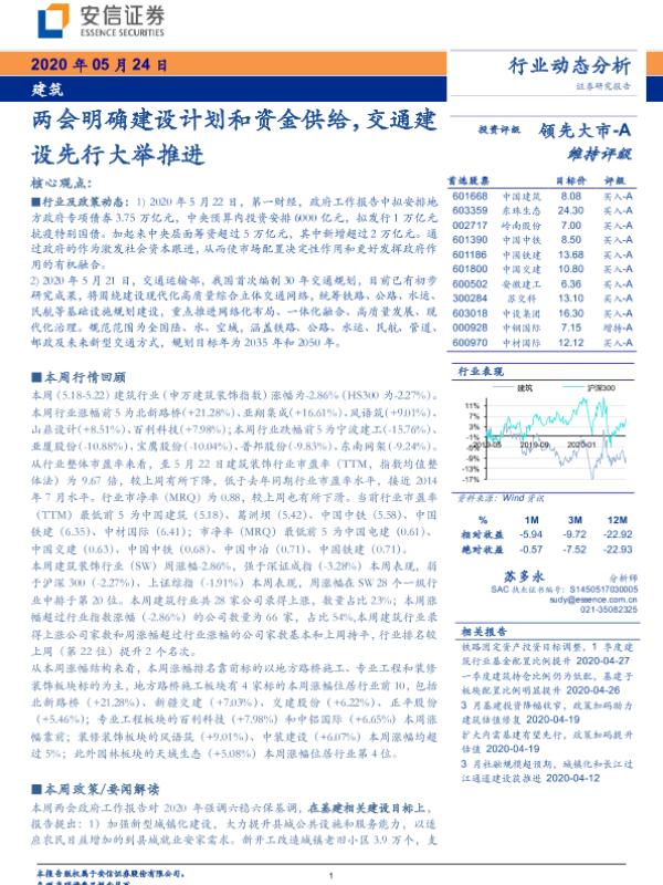 【安信证券】【20200524】建筑:两会明确建设计划和资金供给,交通建设先行大举推进-9页