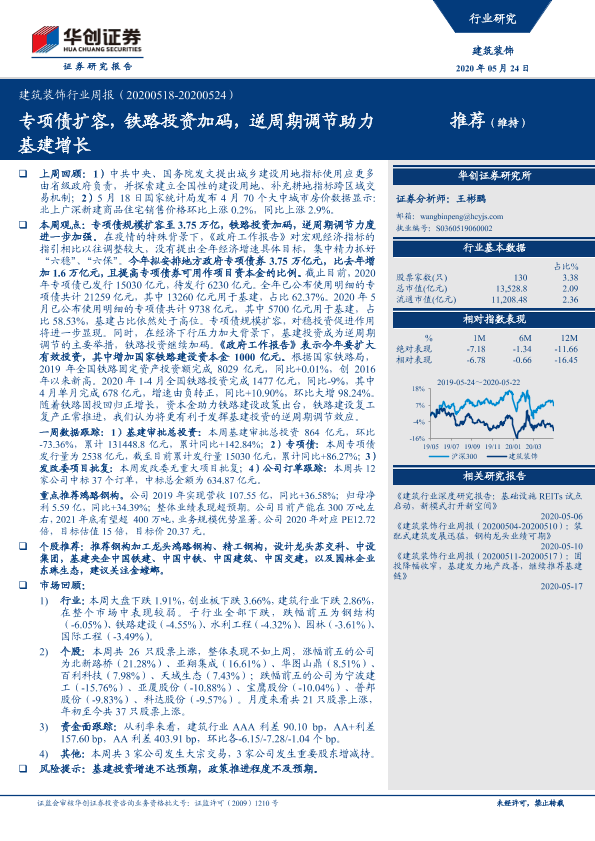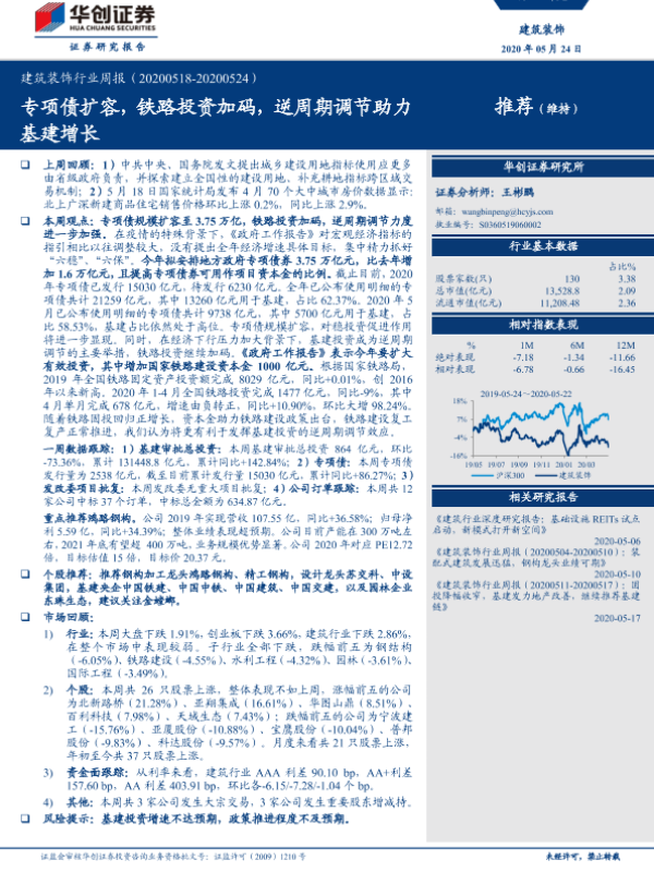 【华创证券】【20200524】建筑装饰行业周报:专项债扩容,铁路投资加码,逆周期调节助力基建增长-19页