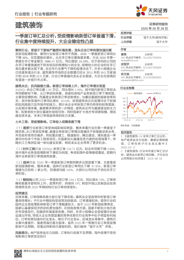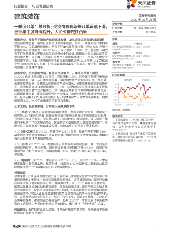 【天风证券】【20200528】一季度订单汇总分析:受疫情影响新签订单普遍下滑,行业集中度持续提升,大企业稳定性凸显-18页