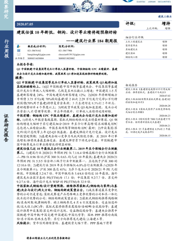【国泰君安证券】【20200705】建筑估值10年新低,钢构、设计等业绩将超预期好转-8页