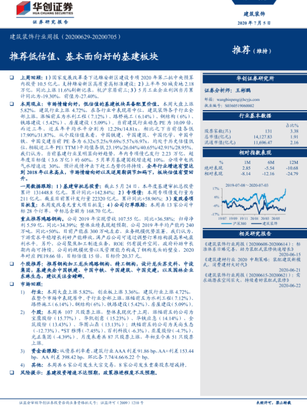 【华创证券】【20200705】建筑装饰行业周报:推荐低估值、基本面向好的基建板块-23页