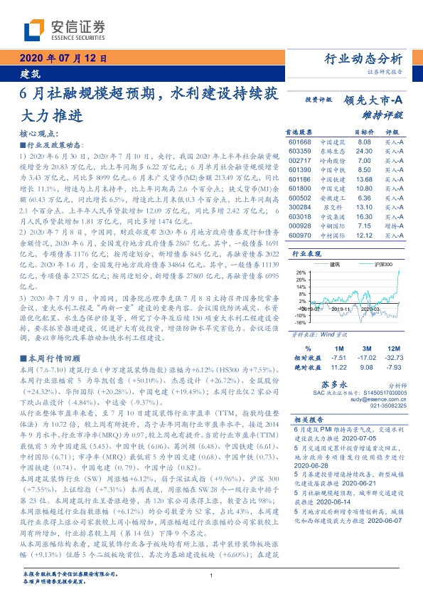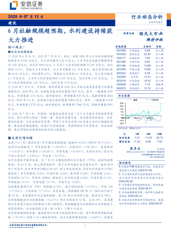 【安信证券】【20200712】建筑行业动态分析:6月社融规模超预期,水利建设持续获大力推进-12页