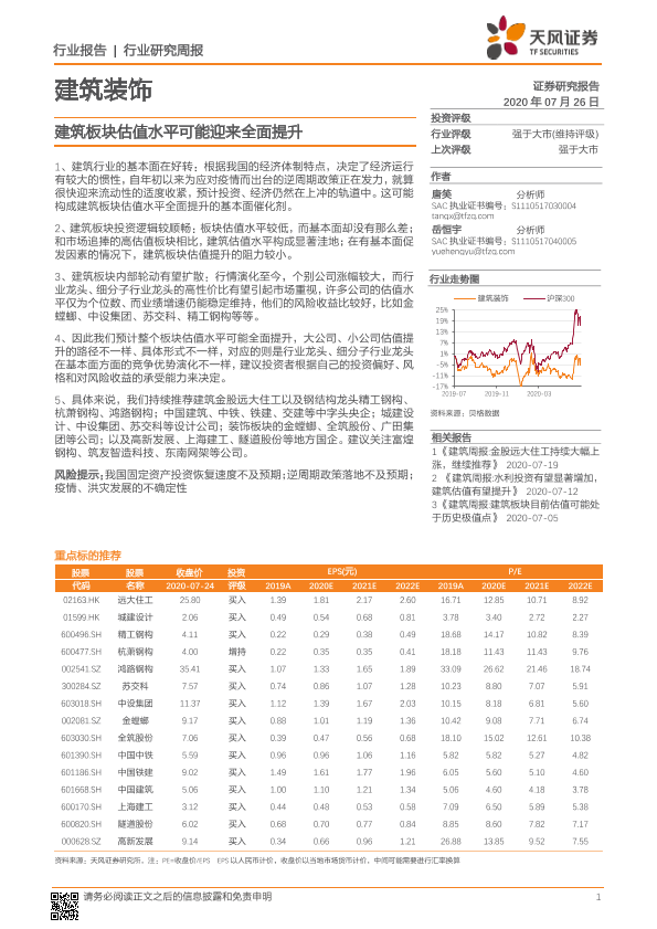 【天风证券】【20200726】建筑装饰行业研究周报:建筑板块估值水平可能迎来全面提升-2页