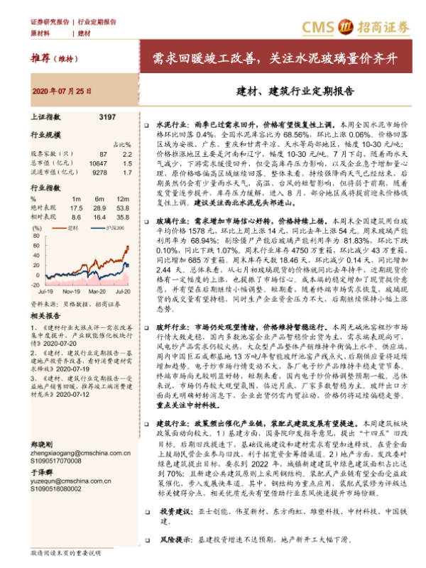 【海通证券】【20200725】建材、建筑行业定期报告:需求回暖竣工改善,关注水泥玻璃量价齐升-33页