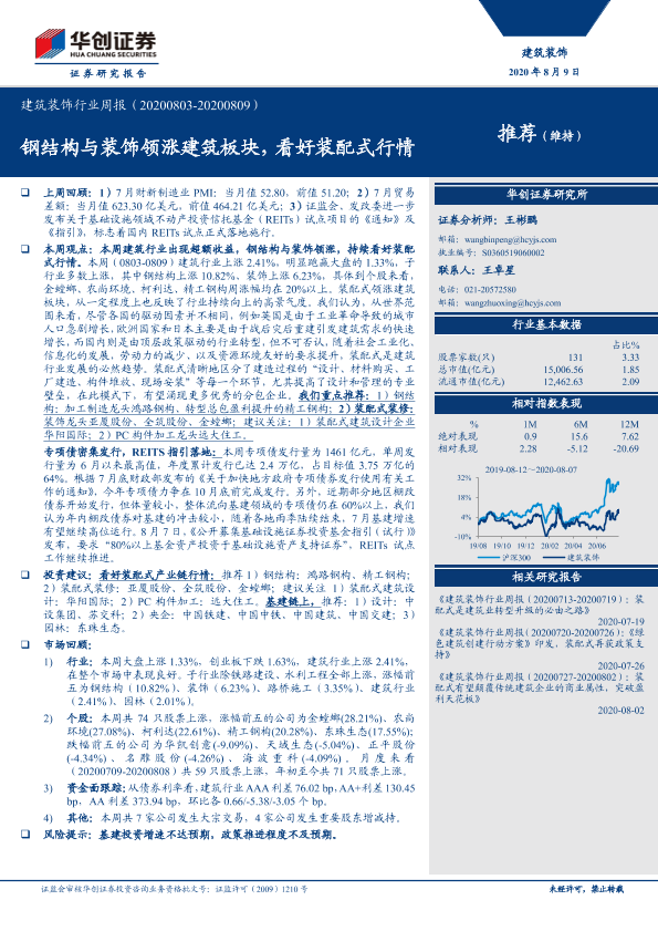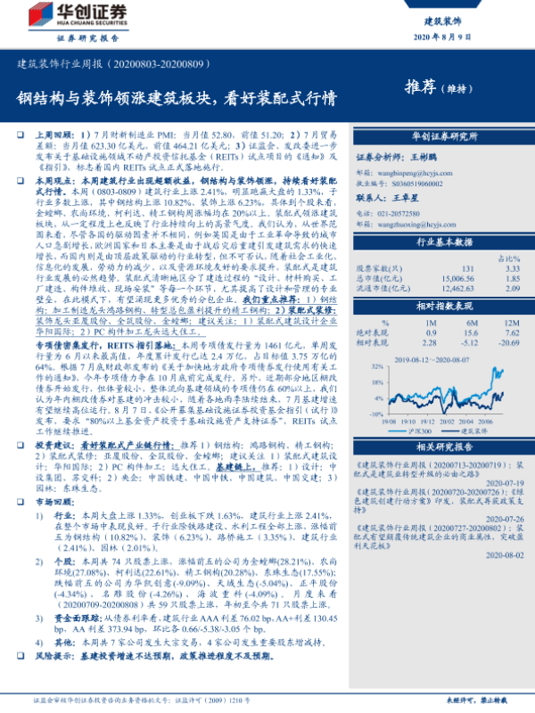 【华创证券】【20200809】建筑装饰行业周报:钢结构与装饰领涨建筑板块,看好装配式行情-19页
