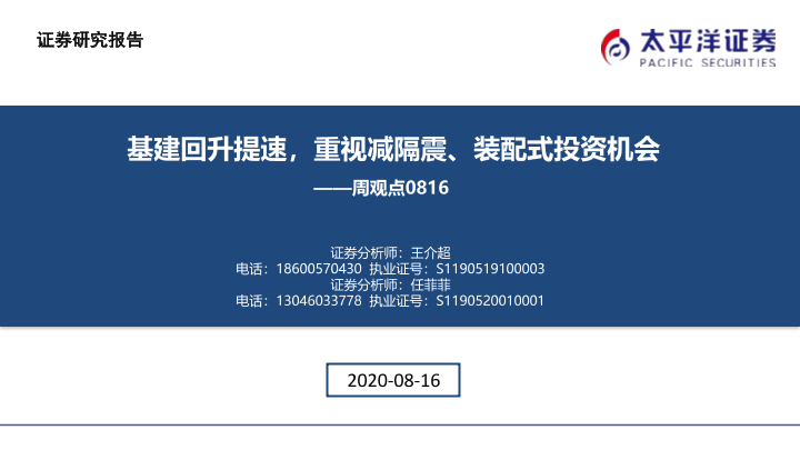 【太平洋证券】【20200816】建筑行业周观点:基建回升提速,重视减隔震、装配式投资机会-43页