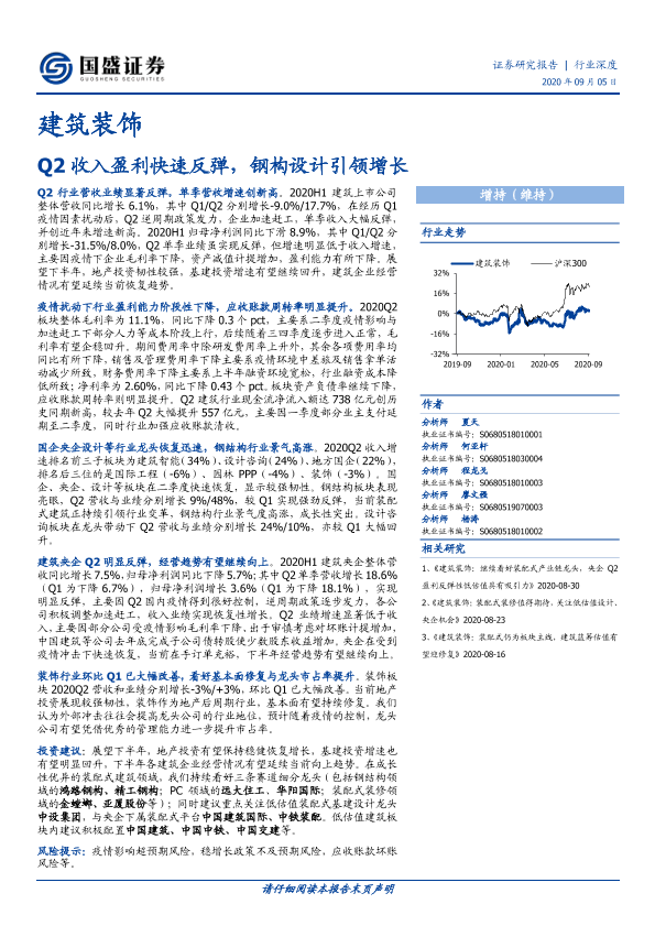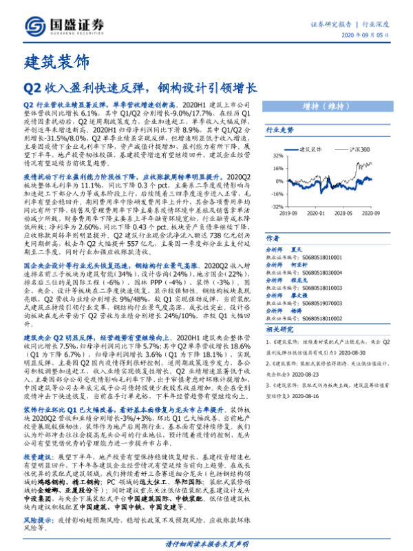 【国盛证券】【20200905】建筑装饰:Q2收入盈利快速反弹,钢构设计引领增长-48页