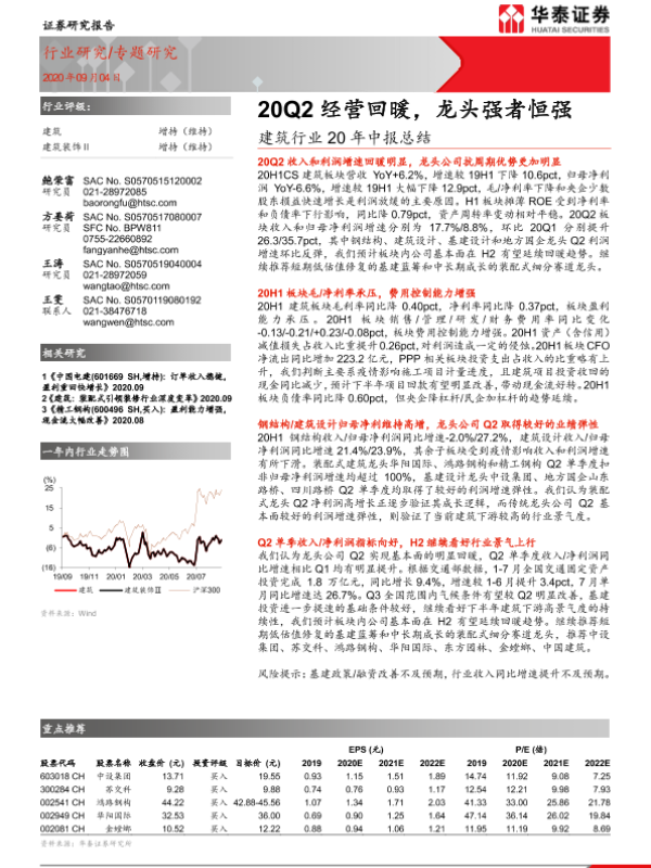 【华泰证券】【20200904】建筑行业20年中报总结:20Q2经营回暖,龙头强者恒强-22页