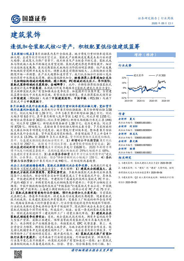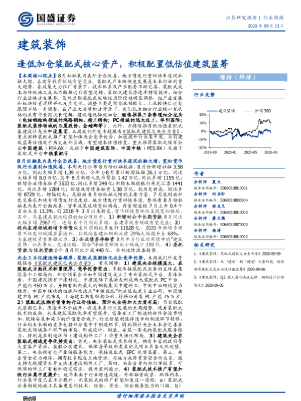 【国盛证券】【20200913】建筑装饰行业周报:逢低加仓装配式核心资产,积极配置低估值建筑蓝筹-19页
