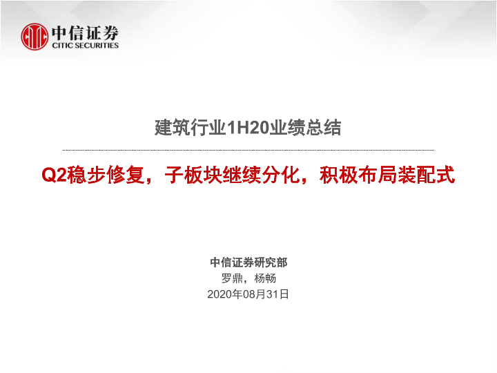 【中信证券】【20200831】建筑行业1H20业绩总结:Q2稳步修复,子板块继续分化,积极布局装配式-84页