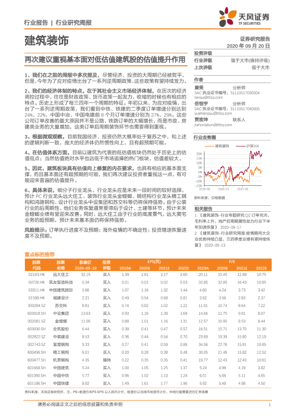 【天风证券】【20200920】建筑装饰行业研究周报:再次建议重视基本面对低估值建筑股的估值提升作用-2页