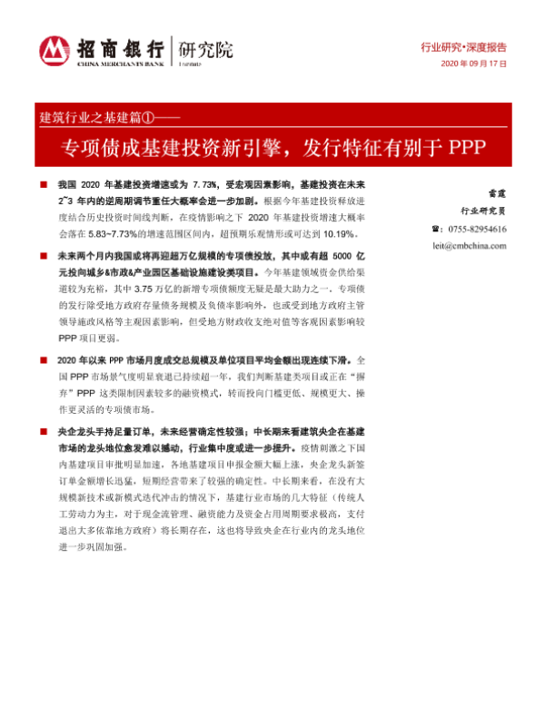 【招商银行】【20200917】建筑行业之基建篇①——专项债成基建投资新引擎,发行特征有别于PPP-48页