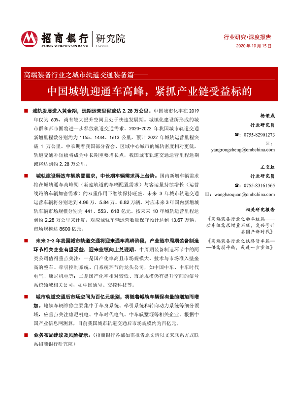 【招商银行】【20201015】高端装备行业之城市轨道交通装备篇:中国城轨迎通车高峰,紧抓产业链受益标的-18页