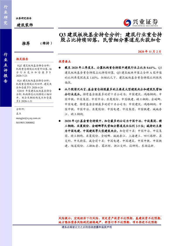 【兴业证券】【20201102】Q3建筑板块基金持仓分析:建筑行业重仓持股占比持续回落,民营细分赛道龙头获加仓-4页