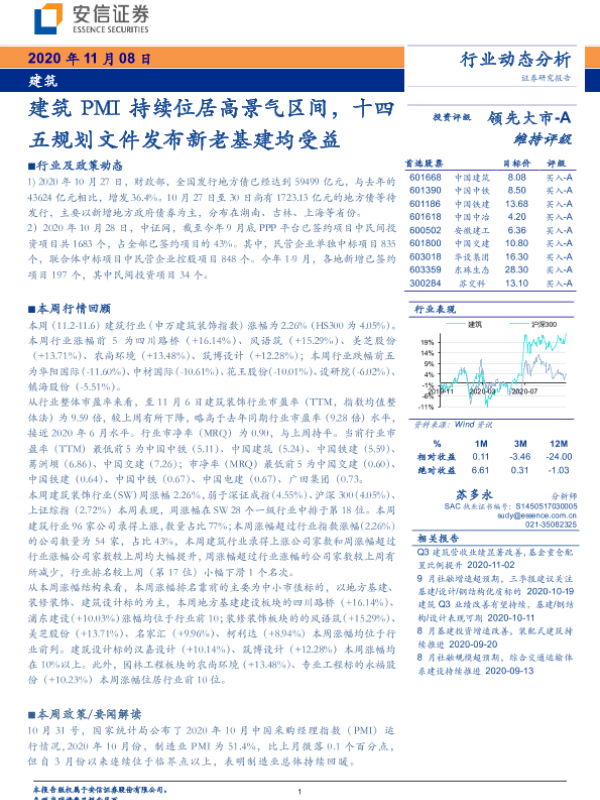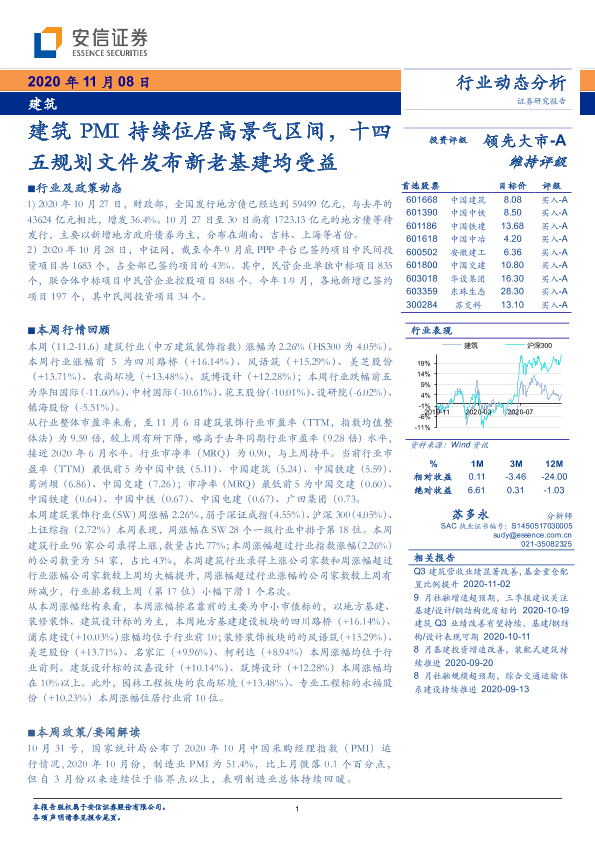 【安信证券】【20201108】建筑:建筑PMI持续位居高景气区间,十四五规划文件发布新老基建均受益-10页