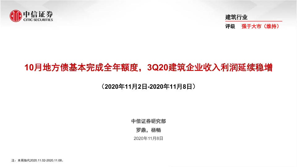 【中信证券】【20201108】10月地方债基本完成全年额度,3Q20建筑企业收入利润延续稳增-45页