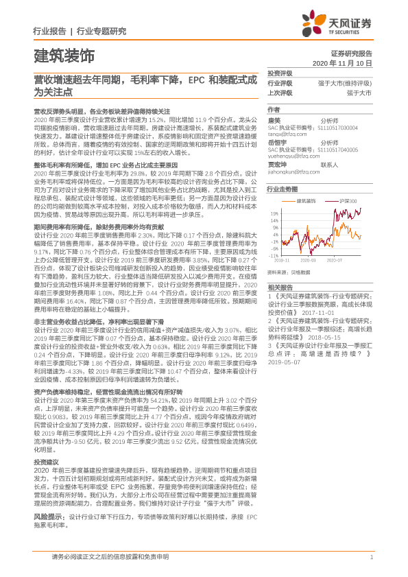 【天风证券】【20201110】建筑装饰行业专题研究:营收增速超去年同期,毛利率下降,EPC和装配式成为关注点-15页
