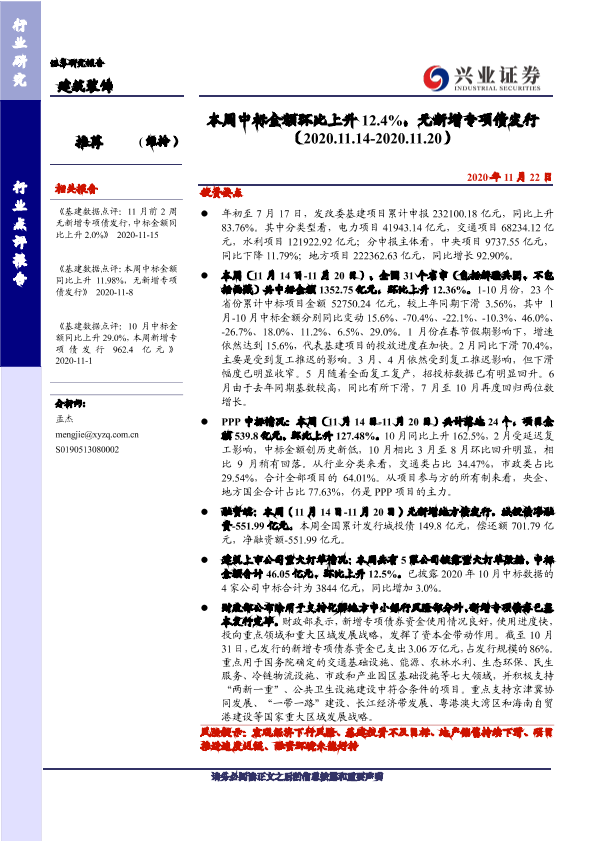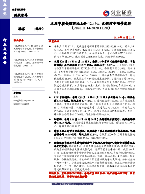 【兴业证券】【20201122】本周中标金额环比上升12.4%,无新增专项债发行-29页