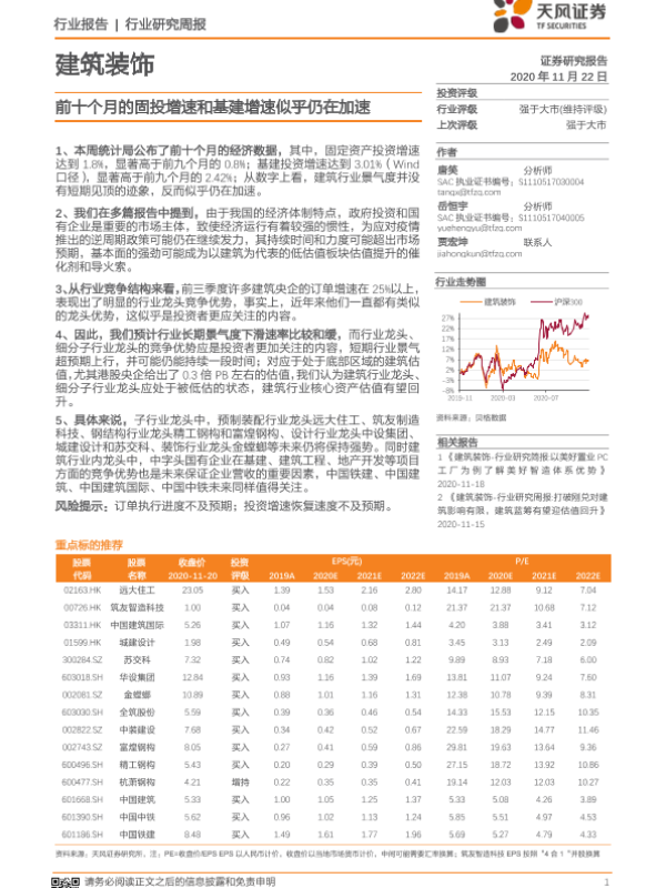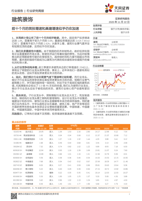 【天风证券】【20201122】建筑装饰行业研究周报:前十个月的固投增速和基建增速似乎仍在加速-2页