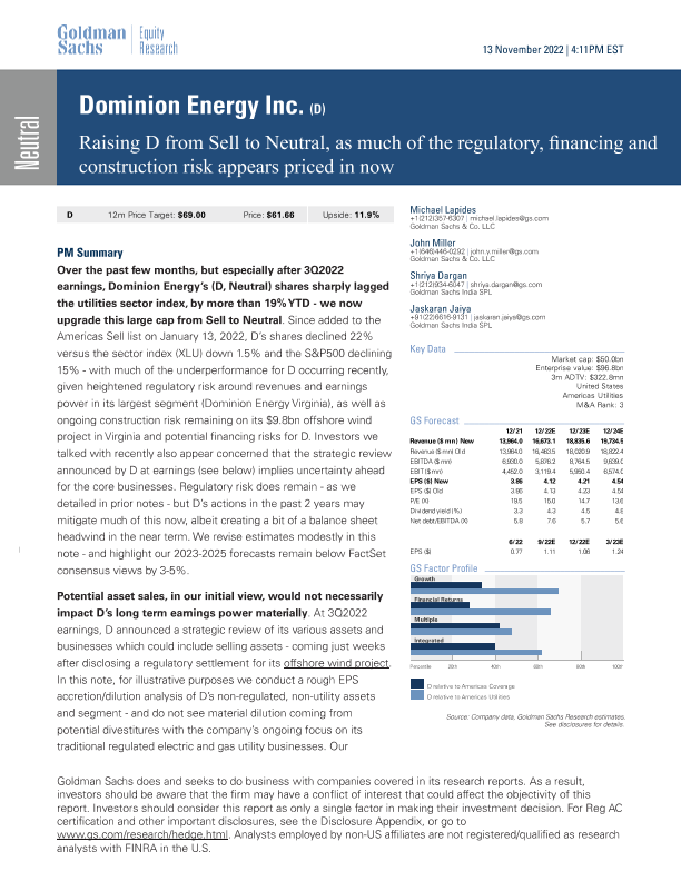 【Goldman Sachs】【20221113】Raising Dominion Energy from Sell to Neutral, as much of the regulatory, financing and construction risk appears priced in now-14页