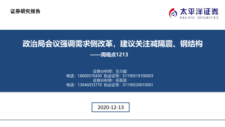 【太平洋证券】【20201213】建筑周观点:政治局会议强调需求侧改革,建议关注减隔震、钢结构-27页