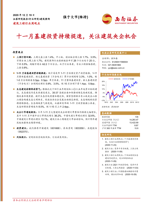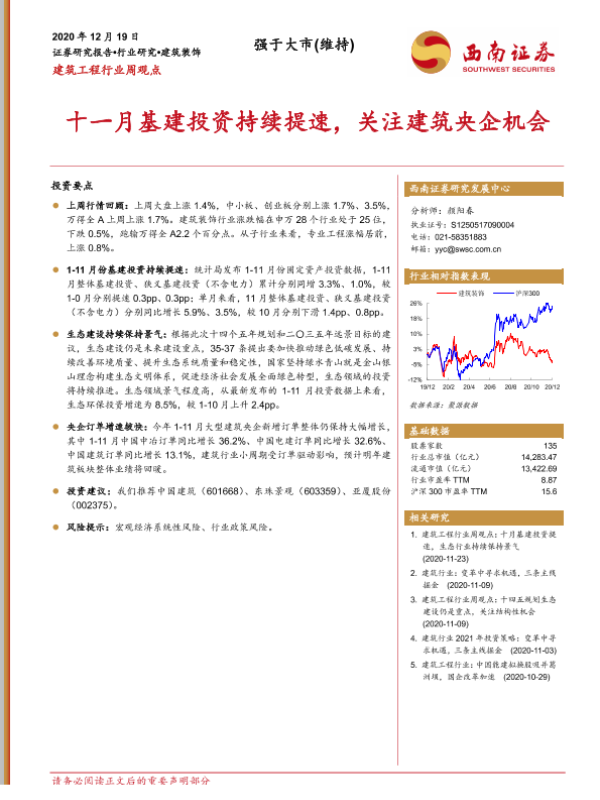 【西南证券】【20201219】建筑工程行业周观点:十一月基建投资持续提速,关注建筑央企机会-11页