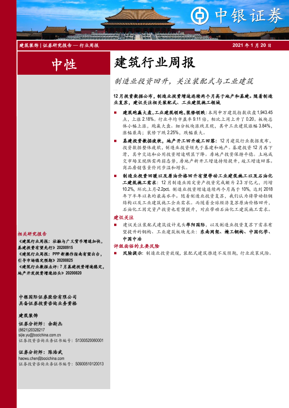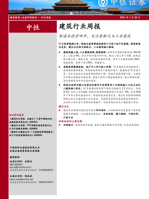 【中银证券】【20210120】建筑行业周报:制造业投资回升,关注装配式与工业建筑-15页