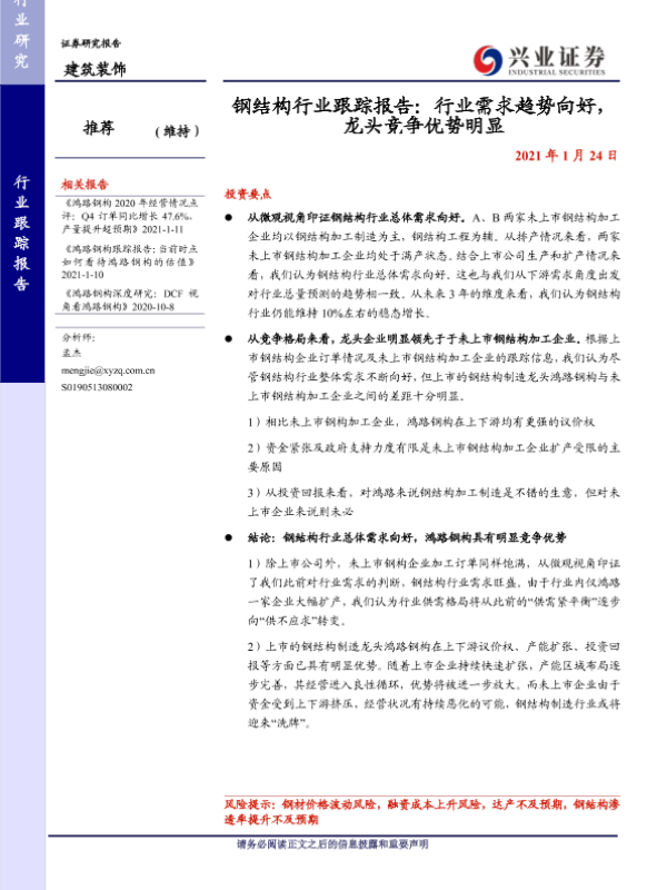 【兴业证券】【20210124】钢结构行业跟踪报告:行业需求趋势向好,龙头竞争优势明显-8页