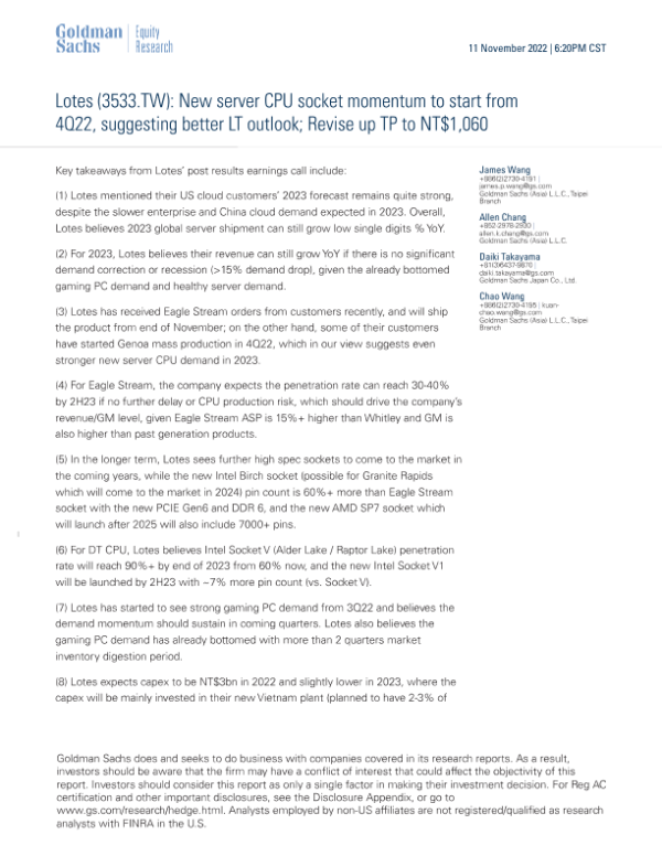 【Goldman Sachs】【20221111】Lotes New server CPU socket momentum to start from 4Q22, suggesting better LT outlook; Revise up TP to NT$1,060-9页