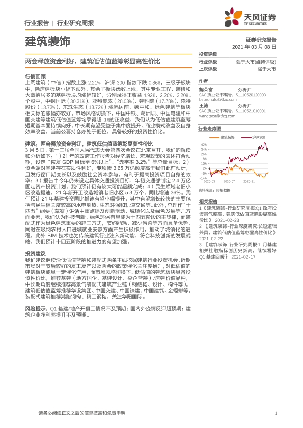 【天风证券】【20210308】建筑装饰行业研究周报:两会释放资金利好,建筑低估值蓝筹彰显高性价比-8页