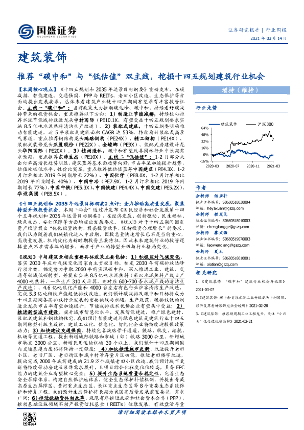 【国盛证券】【20210314】建筑装饰行业周报:推荐“碳中和”与“低估值”双主线,挖掘十四五规划建筑行业机会-15页