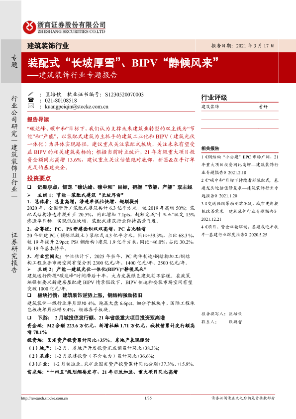 【浙商证券】【20210317】建筑装饰行业专题报告:装配式“长坡厚雪”、BIPV“静候风来”-35页