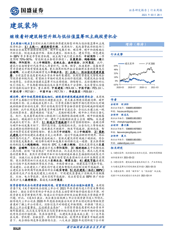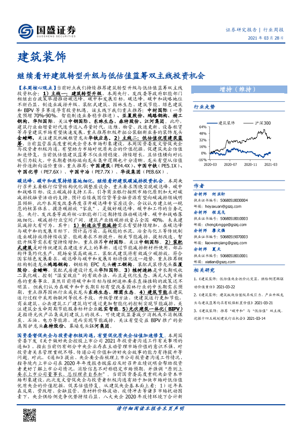 【国盛证券】【20210328】建筑装饰行业周报:继续看好建筑转型升级与低估值蓝筹双主线投资机会-15页