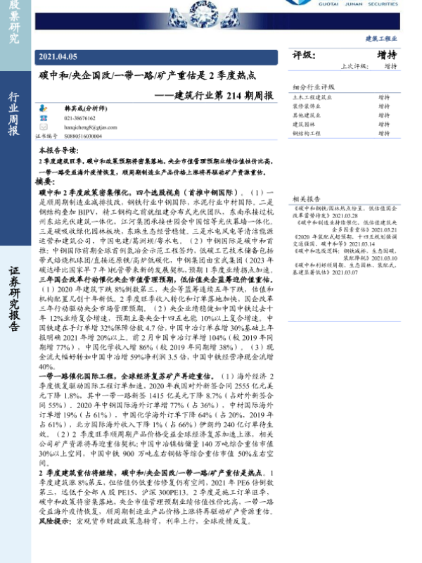 【国泰君安证券】【20210405】建筑行业第214期周报:碳中和 央企国改 一带一路 矿产重估是2季度热点-11页