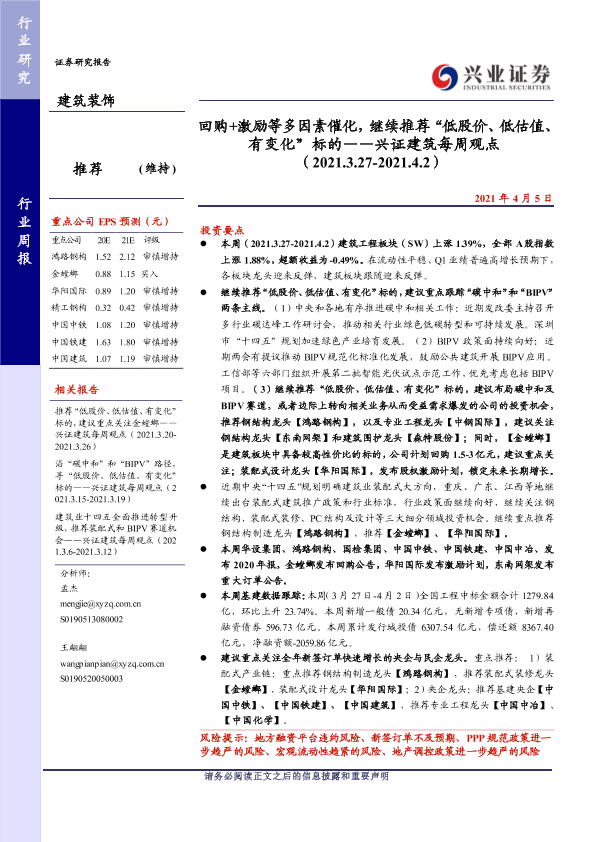 【兴业证券】【20210405】回购+激励等多因素催化,继续推荐“低股价、低估值、有变化”标的——兴证建筑每周观点-50页