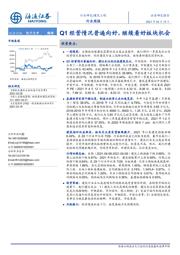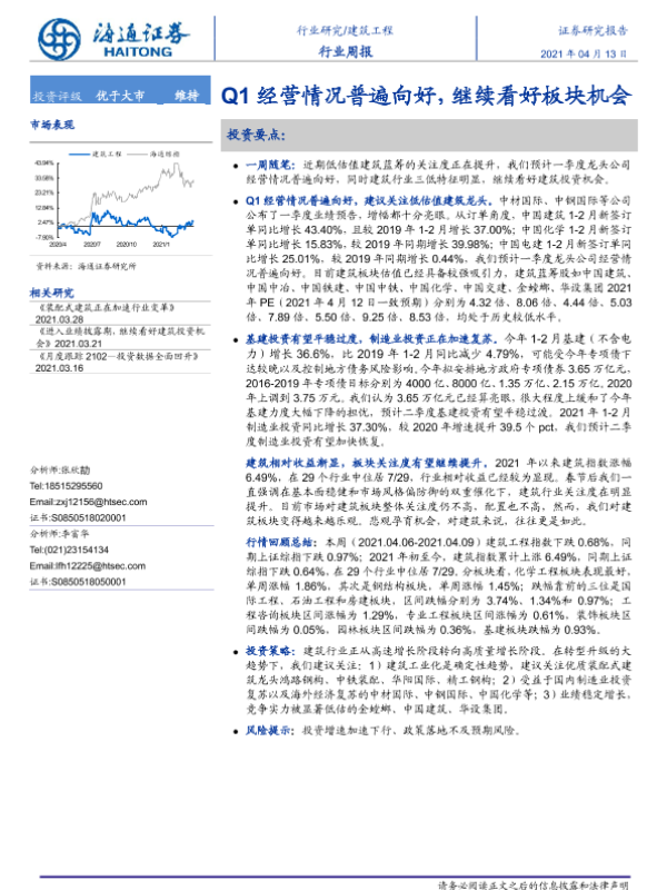 【海通证券】【20210413】建筑工程行业周报:Q1经营情况普遍向好,继续看好板块机会-6页