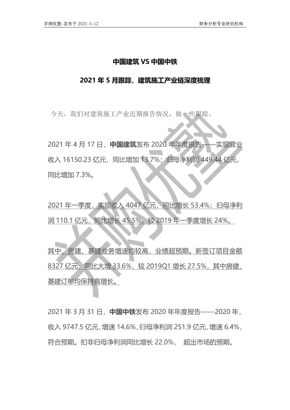 【并购优塾】【20210512】中国建筑VS中国中铁:2021年5月跟踪,建筑施工产业链深度梳理-23页