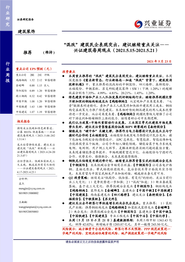 【兴业证券】【20210523】建筑每周观点:“混改”建筑民企表现突出,建议继续重点关注-38页