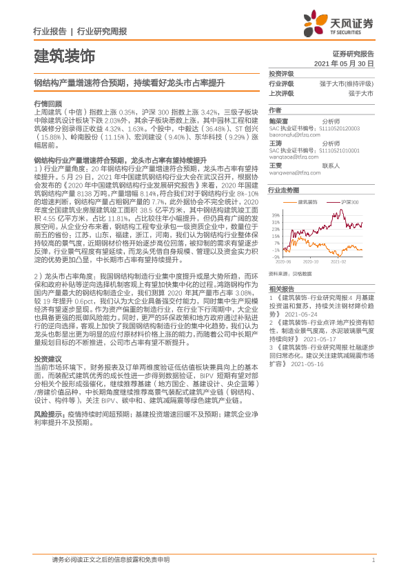 【天风证券】【20210530】建筑装饰行业研究周报:钢结构产量增速符合预期,持续看好龙头市占率提升-5页
