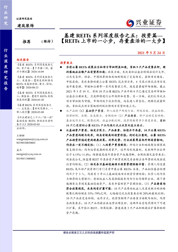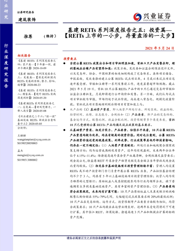 【兴业证券】【20210524】基建REITs系列深度报告之五:投资篇—【REITs上市的一小步,存量盘活的一大步】-100页