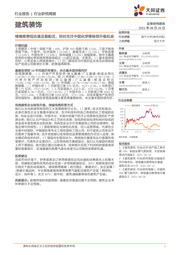 【天风证券】【20210620】建筑装饰行业研究周报:继续推荐低估值及装配式,同时关注中国化学等转型升级机会-7页