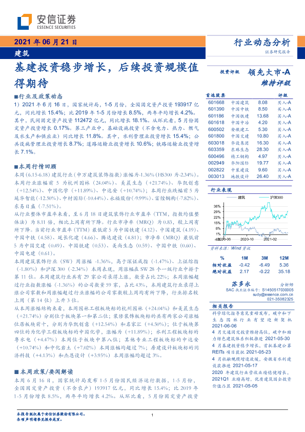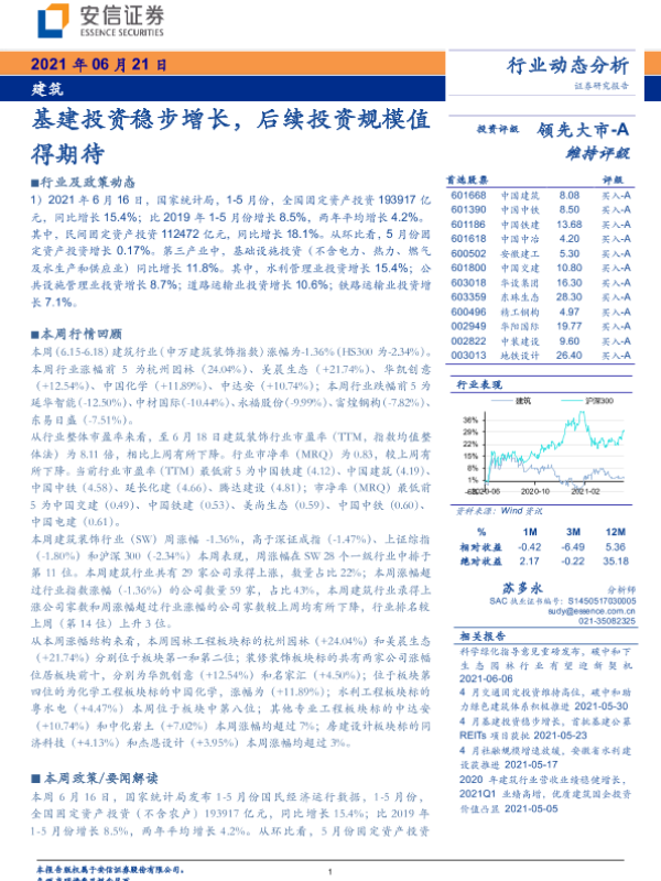 【安信证券】【20210621】建筑行业动态分析:基建投资稳步增长,后续投资规模值得期待-11页