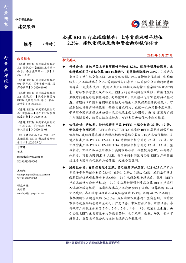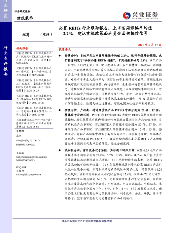 【兴业证券】【20210627】公募REITs行业跟踪报告:上市首周涨幅平均值2.2%,建议重视政策面和资金面积极信信号-36页