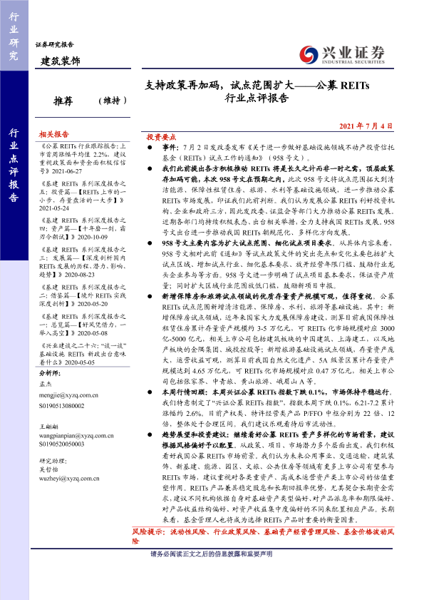 【兴业证券】【20210704】支持政策再加码,试点范围扩大——公募REITs行业点评报告-19页