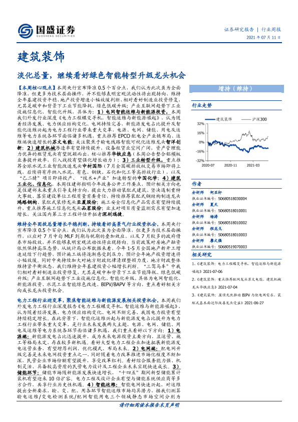 【国盛证券】【20210711】建筑装饰行业周报:淡化总量,继续看好绿色智能转型升级龙头机会-17页